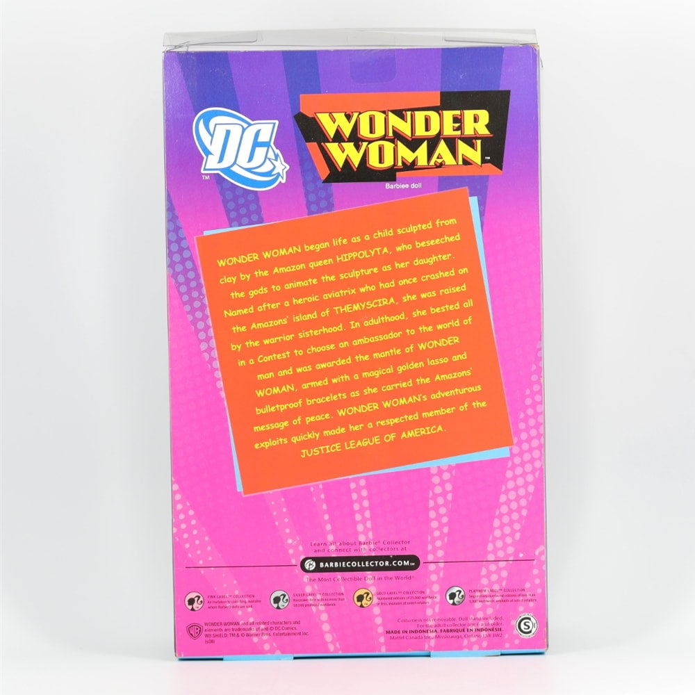 A never removed from the box Wonder Woman Barbie by Mattel's Pink Label. This one is in excellent, collectible condition. The doll is minty fresh inside her box. The box has some shelf wear and rubs, as well as a scratch on the front window, and the top bows out a little.