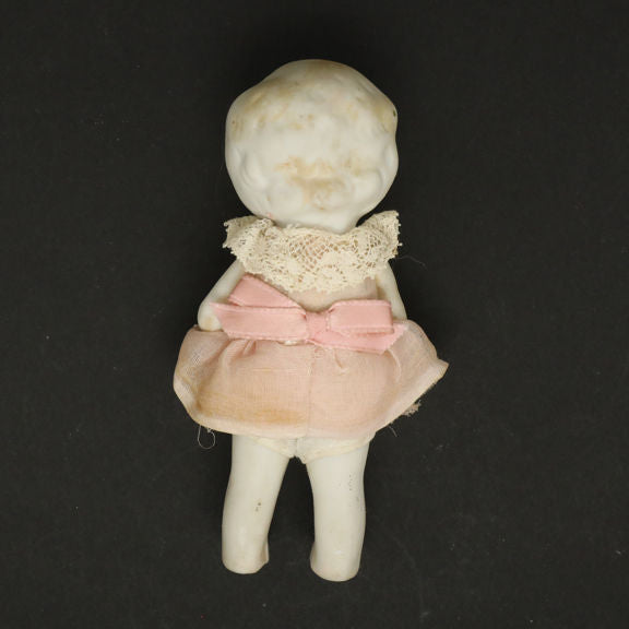 Molded, painted blond hair with hair band; Painted face (nick at chin) is original and intact but with typically lower standards; Swivel arms on single mold of head, torso and legs (chipped toes on feet). Original dress, petticoat, and panty.