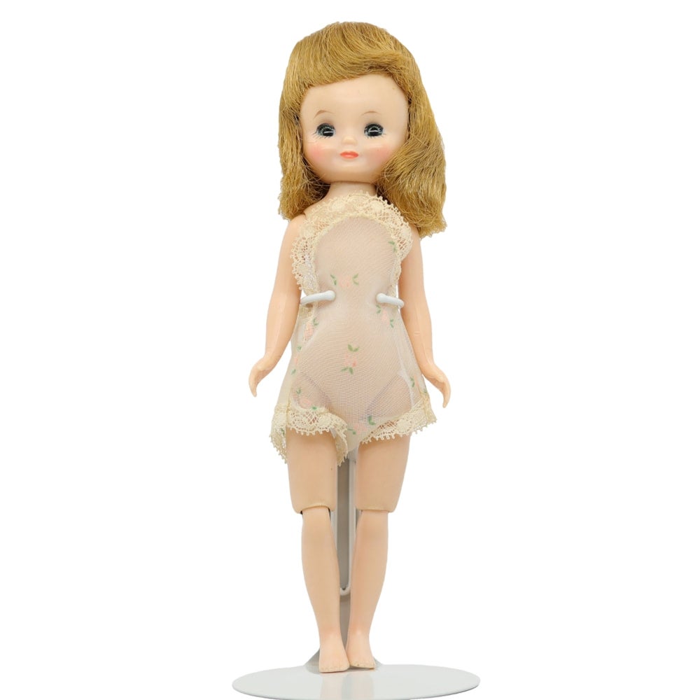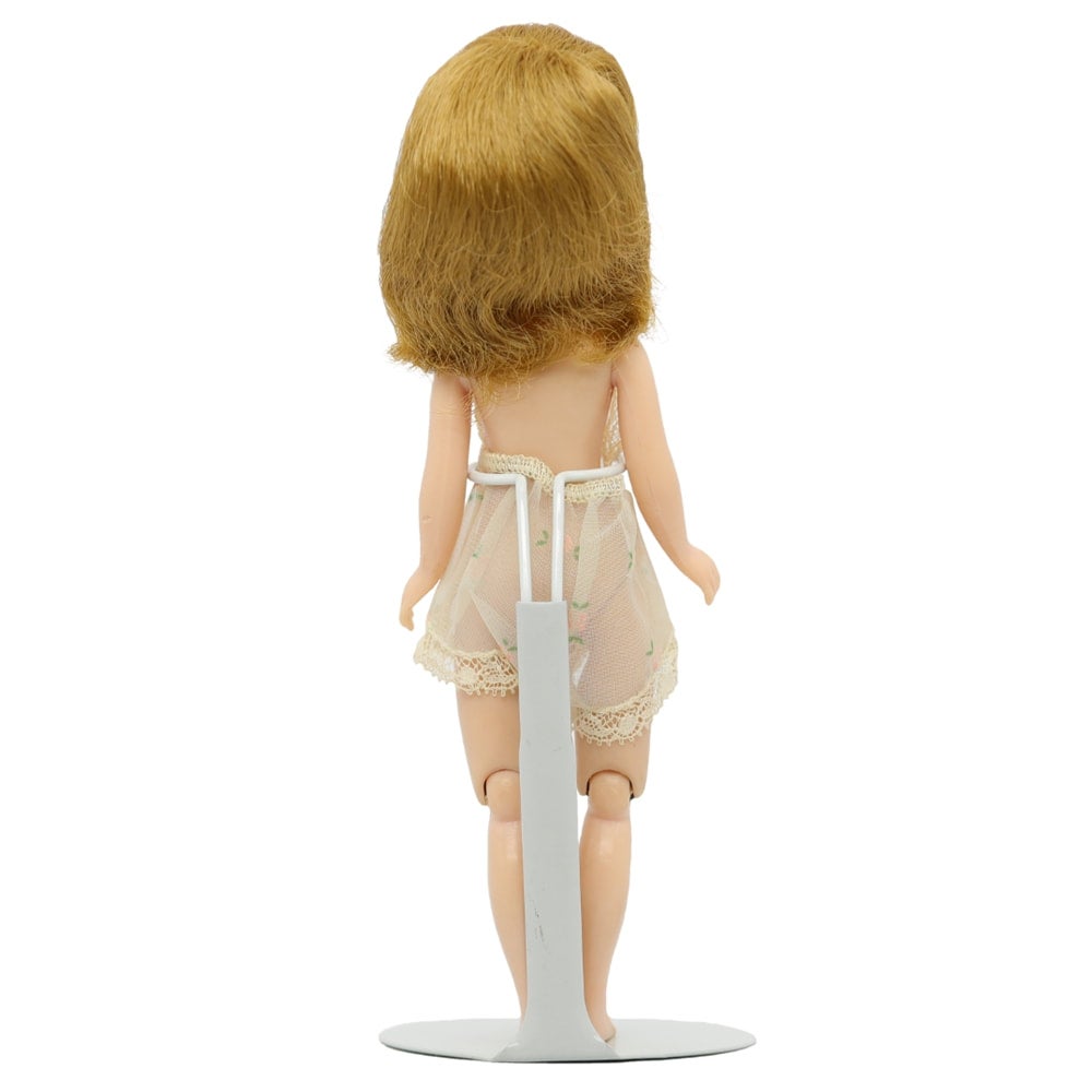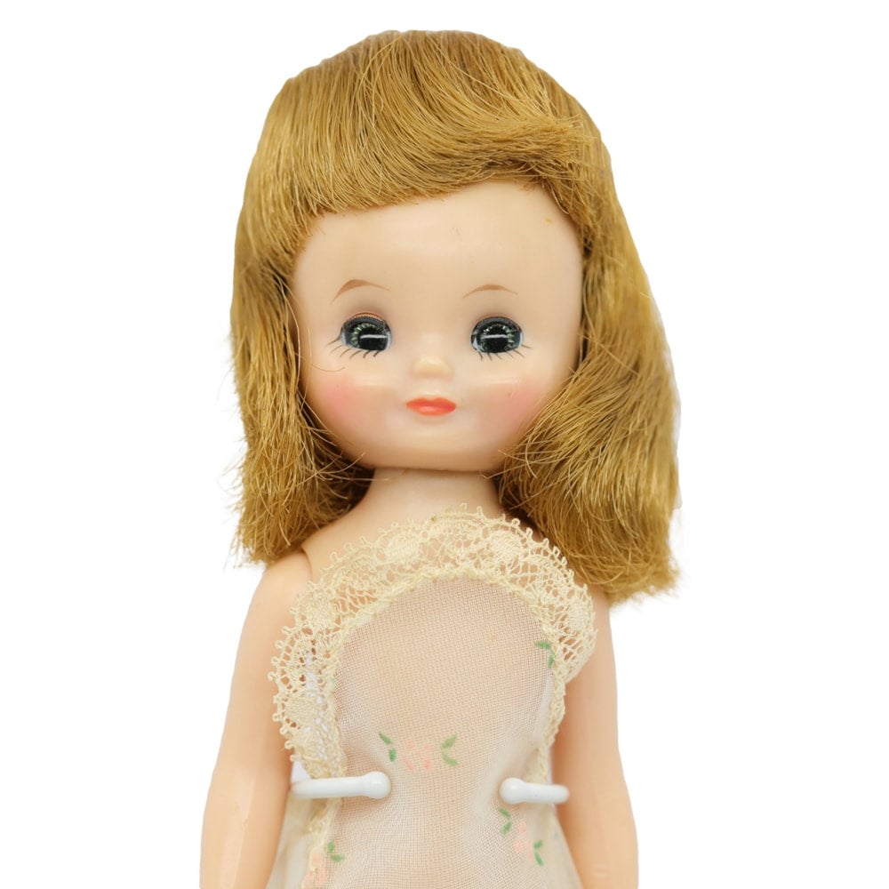 Pretty face paint. Hair is thicker on one side no barrettes. Arms both have some dents or chew marks, specifically the right arm and left hand/wrist. She has the start of a fine stress line at one knee joint. Wearing original chemise.