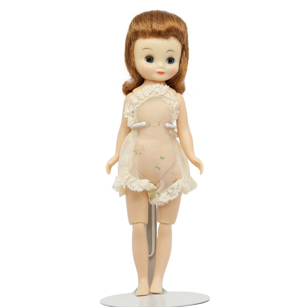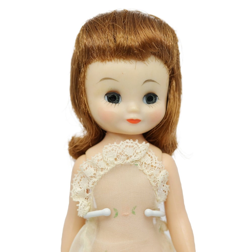 Pretty hair but on inspection you see that the wig, although it is a factory Betsy wig, is not typical; it has a matting under bangs and it is thinner on top. Her face has a light complexion with nice paint, no rubs. She has a light stain on her back, visible in her photo.