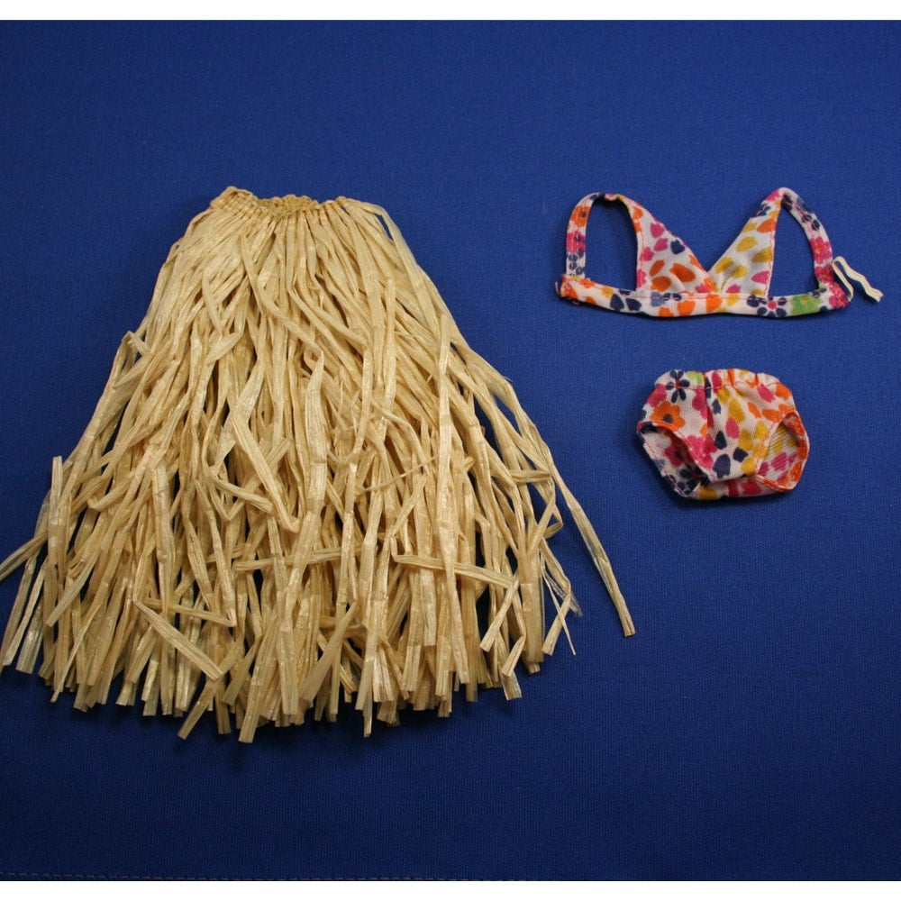 Grass skirt, swimsuit top and bottoms