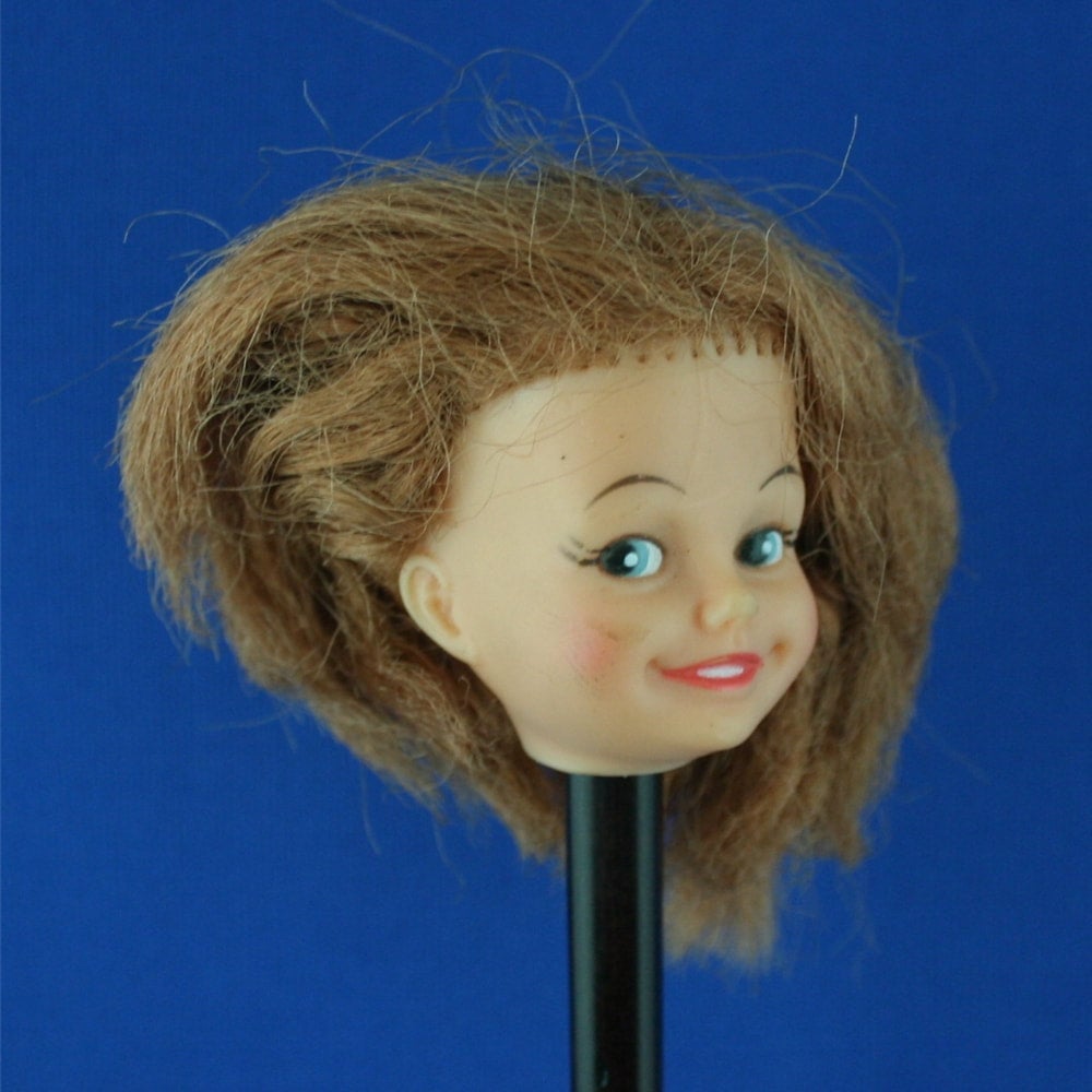 Redhead; face paint is rubbed and hair is cut. Pleasant skin tone and blush. With some love and a brush she could still clean up. (Cheap price, so no questions please.)