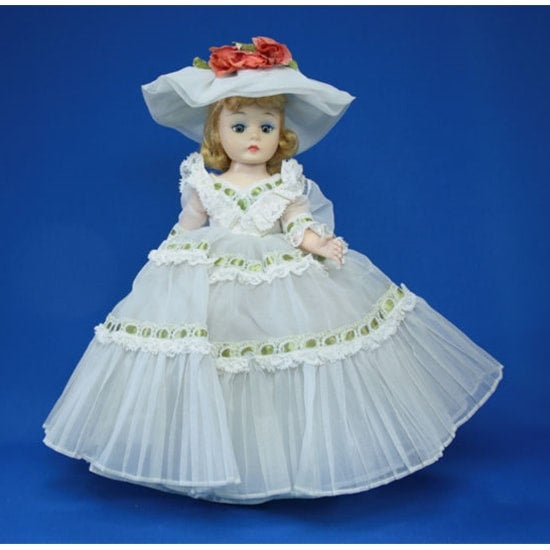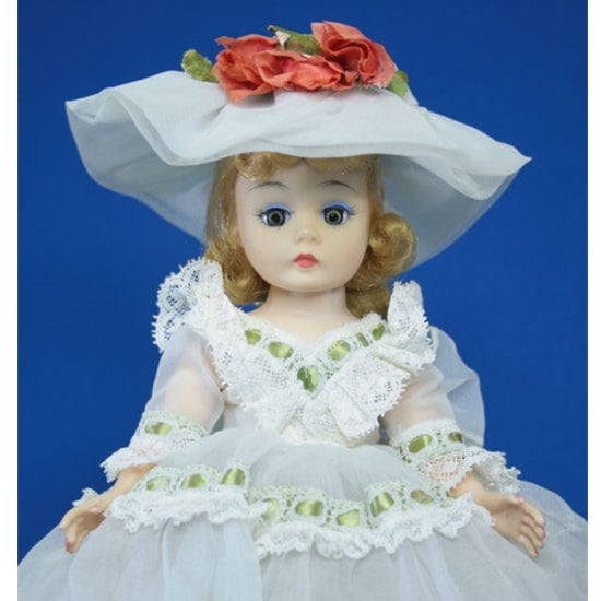 ca. 1968; Original white hat w/ red flowers & original white organdy gown w/ green ribbon & lace trim; added panties, & white heels;