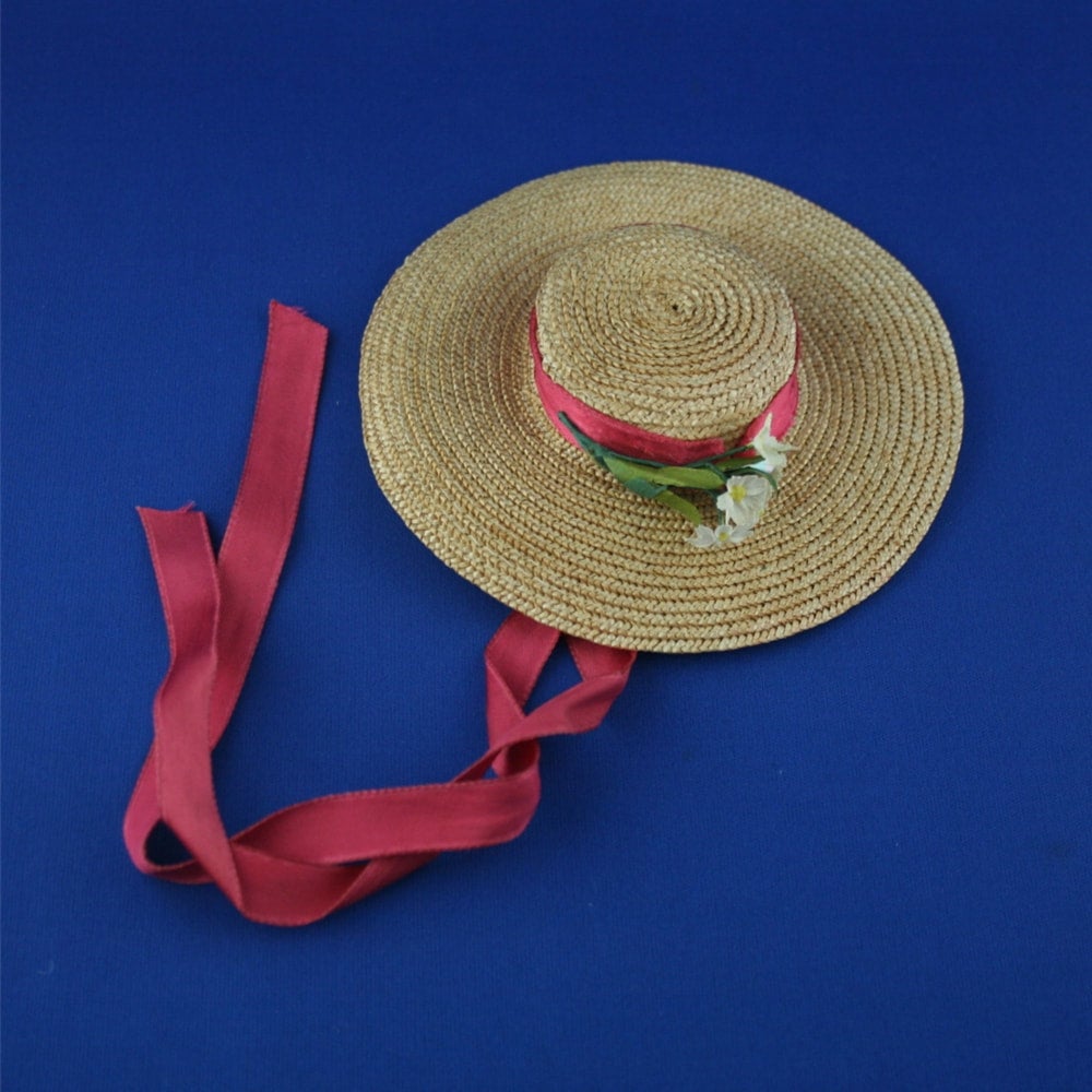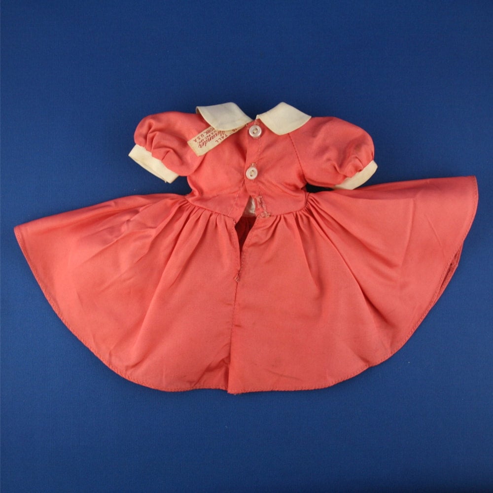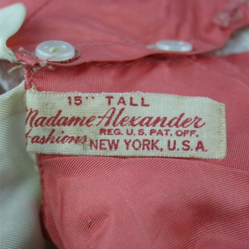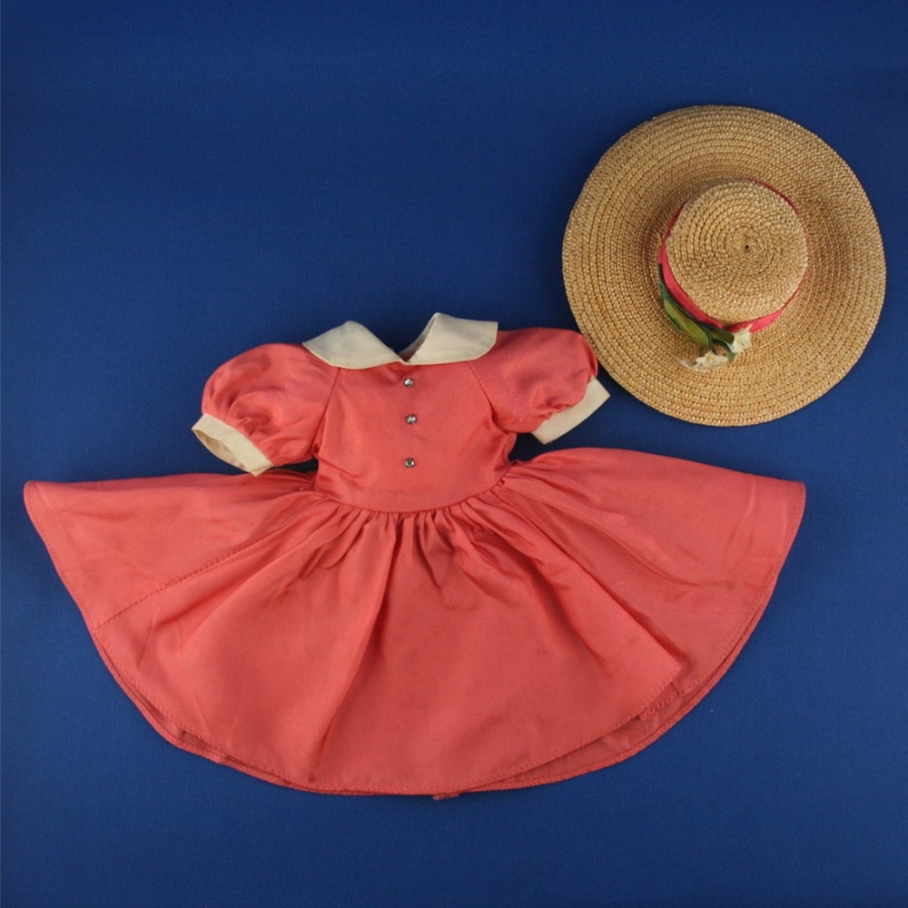 Tag says "15" ALEXANDER". It is too small for an Elise. This dress is red taffeta with white taffeta collar and sleeve trim. The hat is of fine, natural straw with matching ribbon ties. Both hat and dress are in uncommonly nice condition.