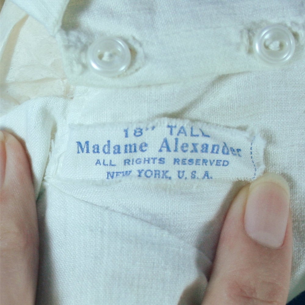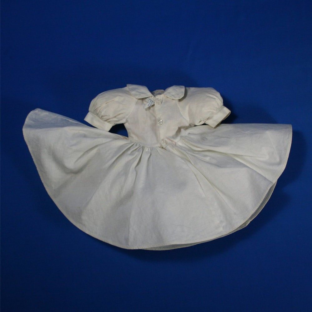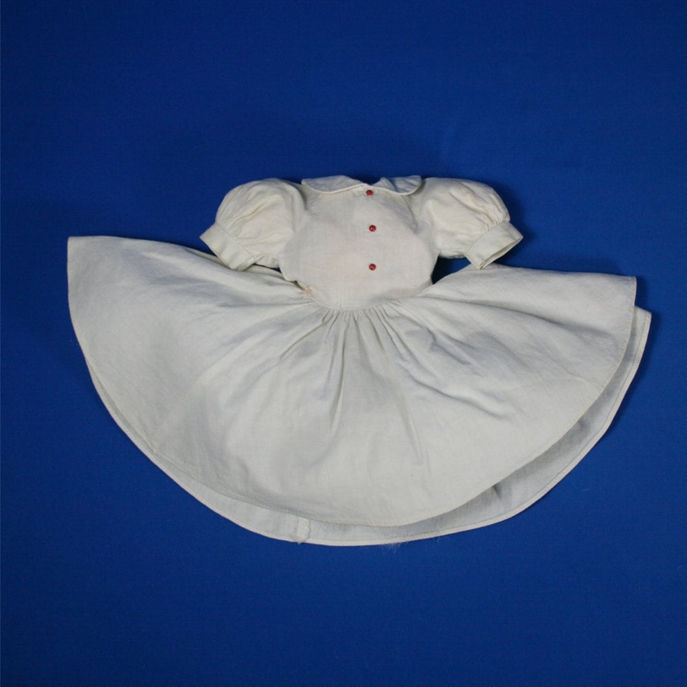 - Dress: White cotton, Peter Pan collar, puff sleeves; Three, red metal buttons