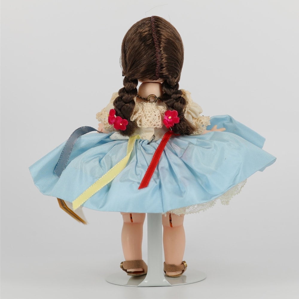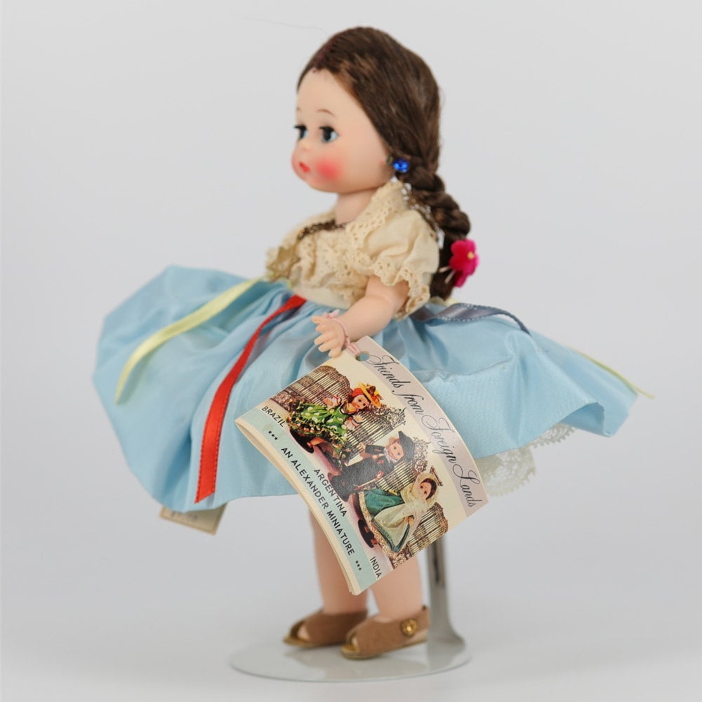 This is an earlier version of the Israel Madame Alexander dolls. Her head turns left and right as her legs walk. Her sleep eyes work. She is in overall very good condition with working, walking motions. Her blouse is a touch yellowed from age. One leg bends, the other is pretty stiff. Has original, older tag and box. Box has some wear.