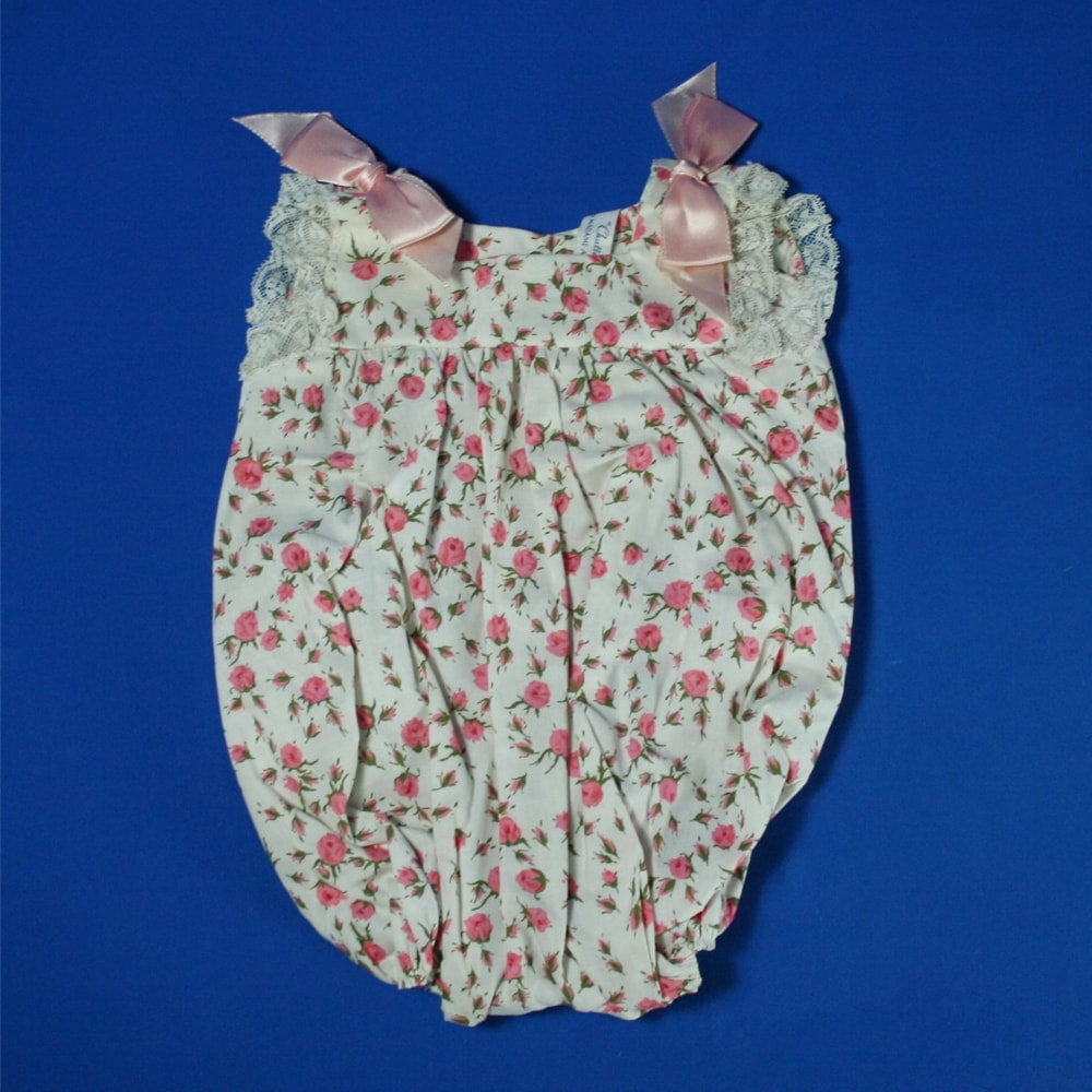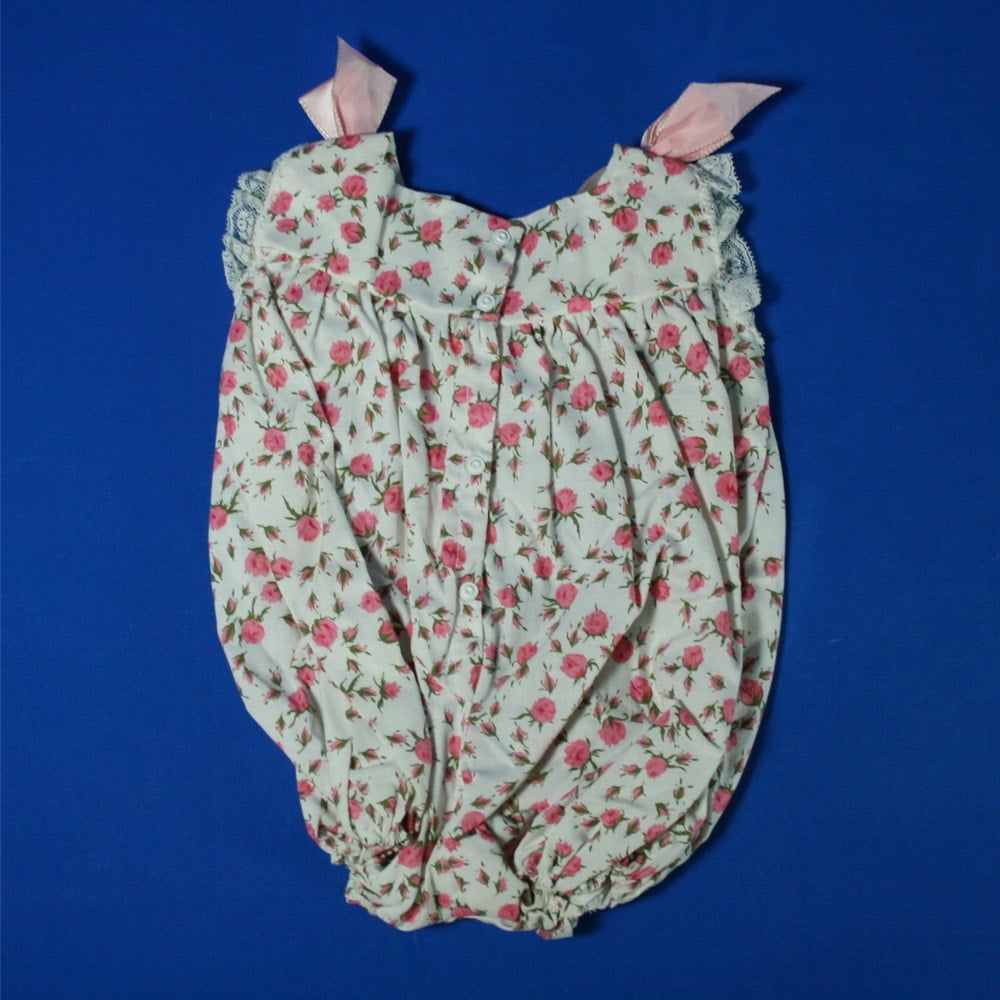 - Pristine rose bud print fabric top to bottom with pristine pink satin bows at shoulders.