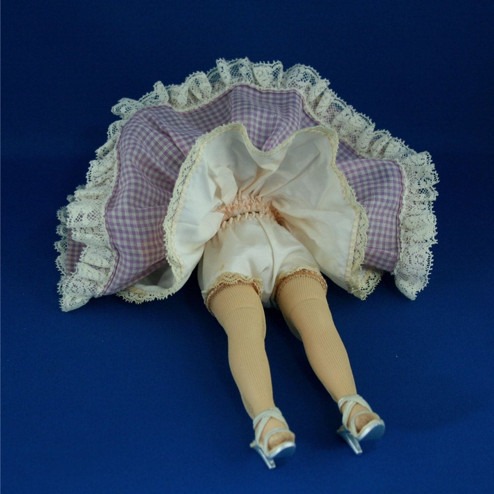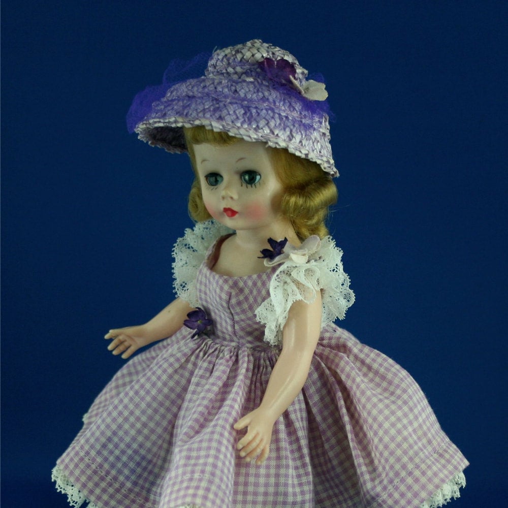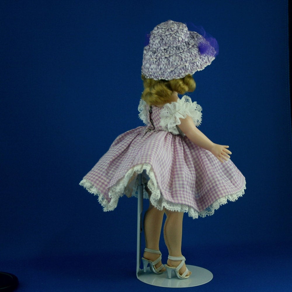 #822 Blond; All original in lavender checked gingham dress which is in near mint condition with only little age color on panties' lace. Face paint is perfect with blush. Her body is real nice: just some pinkish color on her back/bottom keeps it from rating perfection. Well styled hair with no fly-aways. This particular dress has a cluster violets at the shoulder as well as the one at the waist which we don't usually see. The same violets trim her lavender cloche hat along with pretty violet tulle. Her pink taffeta half slip and silver heels are also near mint to mint.
