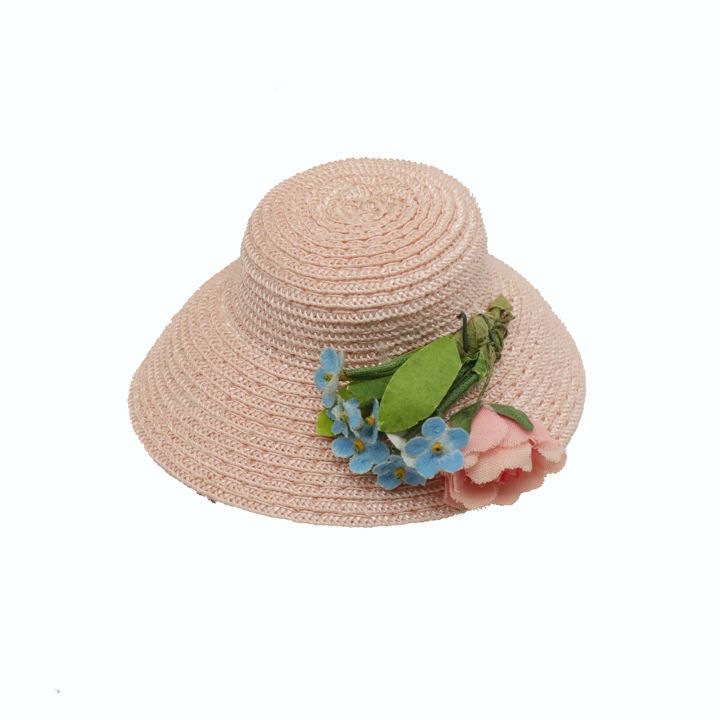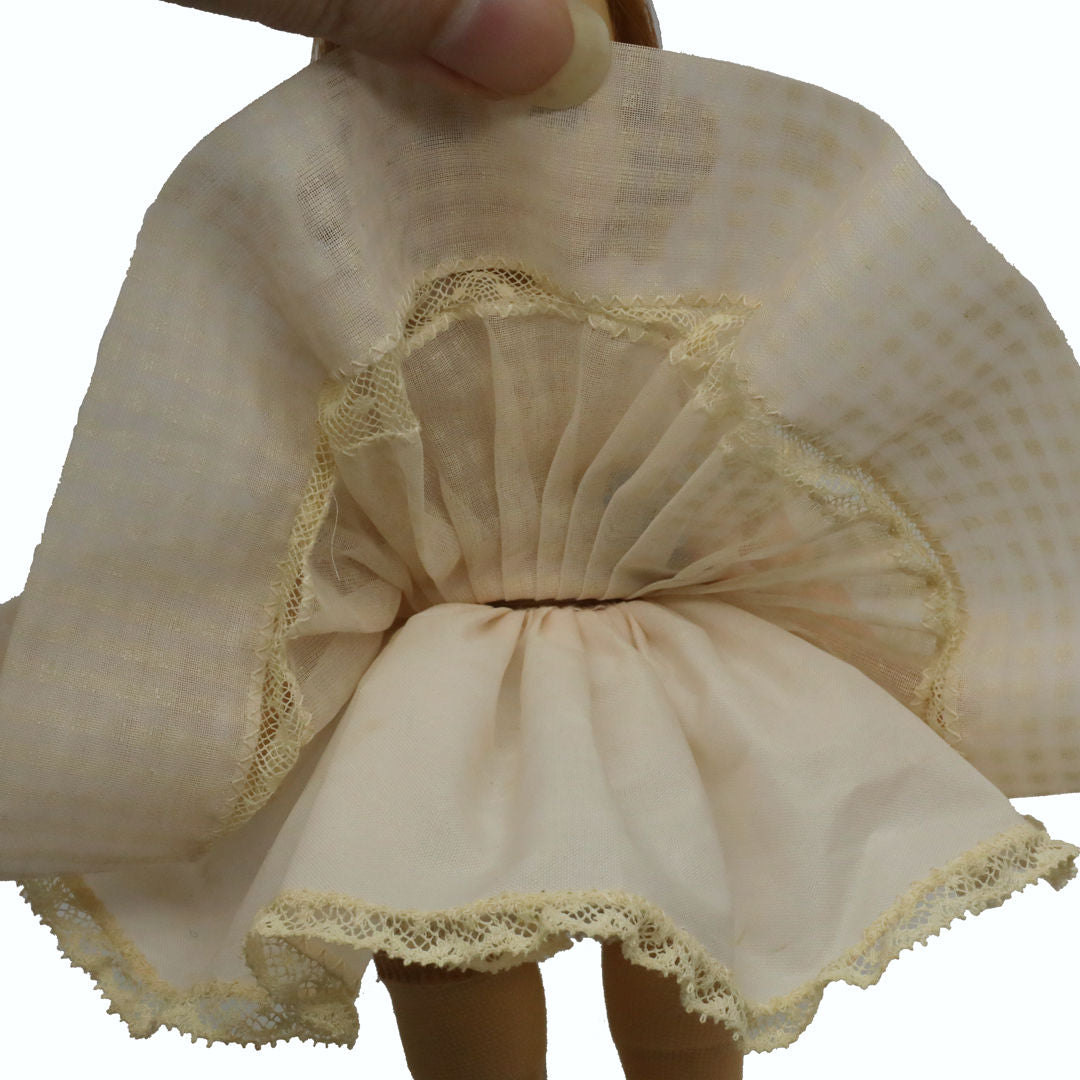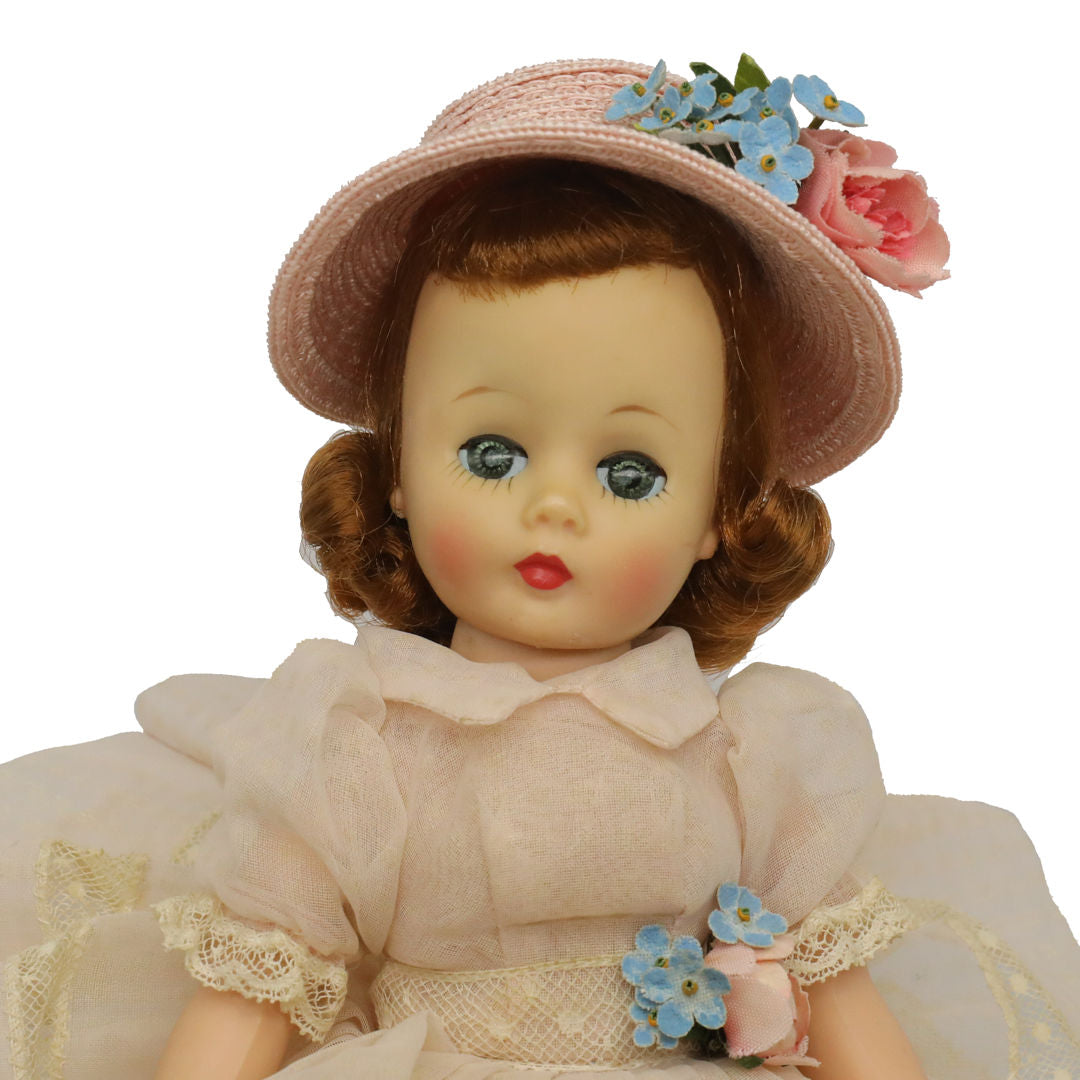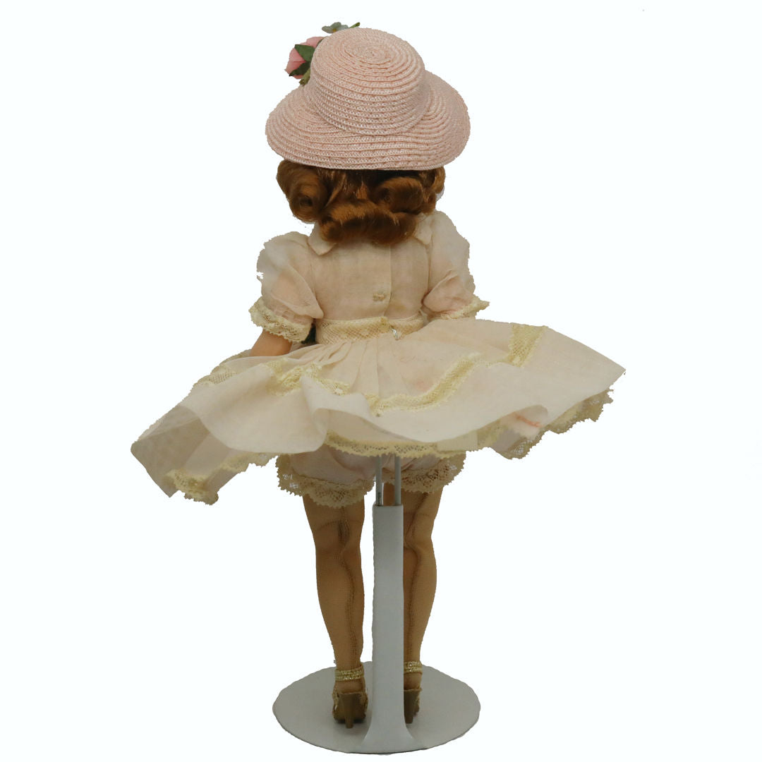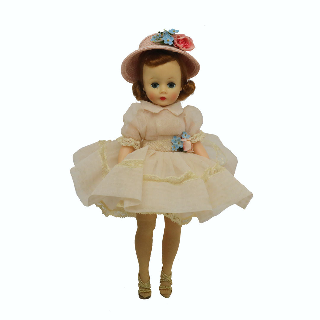 All original, this precious pink ensemble is hard to find and very, very pretty. The beautiful soft pink coloring of the organdy dress has not faded to a typical gray, a common problem of even the would be mint in box finds. It has lovely design detailing. The first part of the skirt at waist is a pleated section, then an inserted band of lace, and last a full, deep hem. Her pink hat has rose and forget-me-not flowers matching those on dress. Pink slip and panties, hose and gold heels all wonderful.
