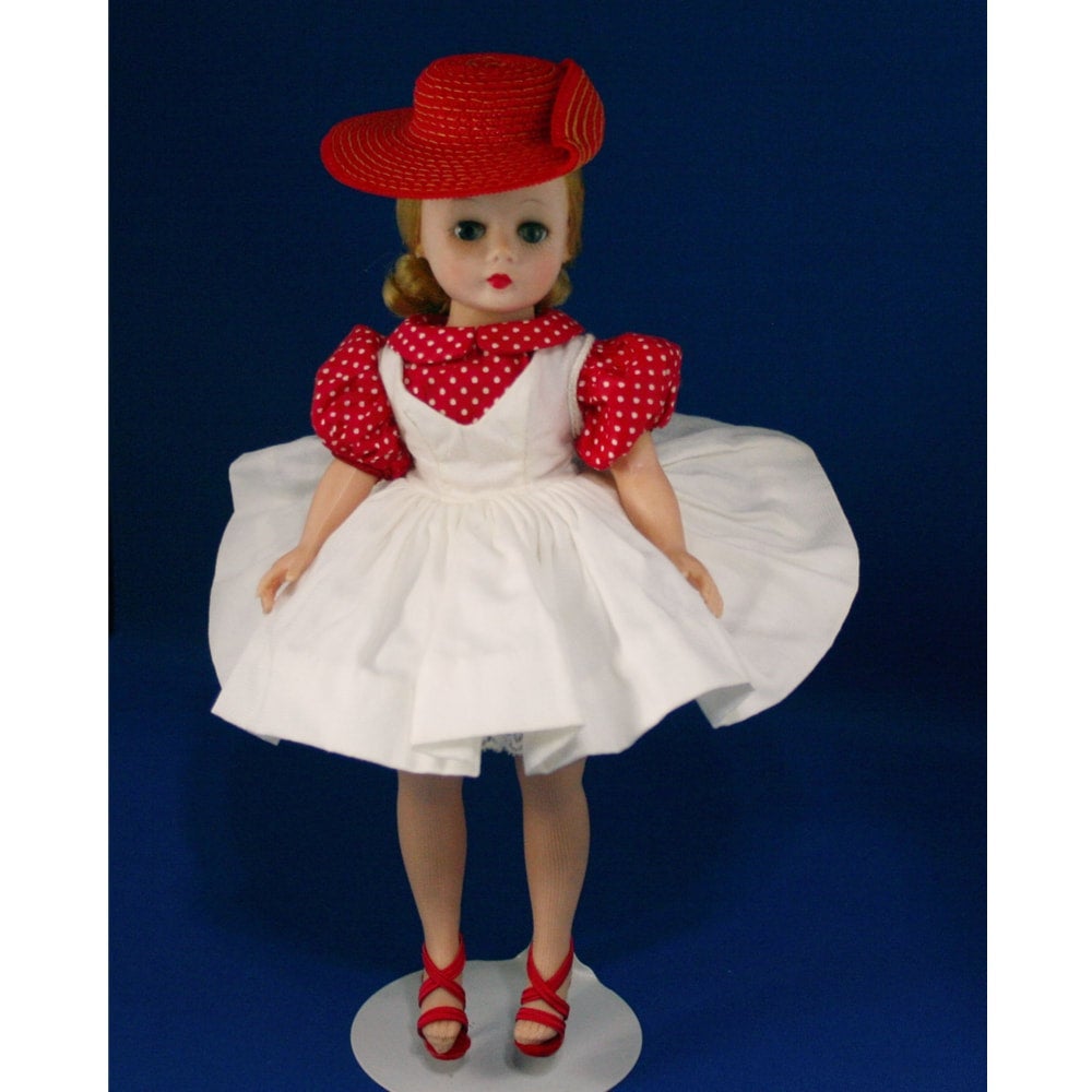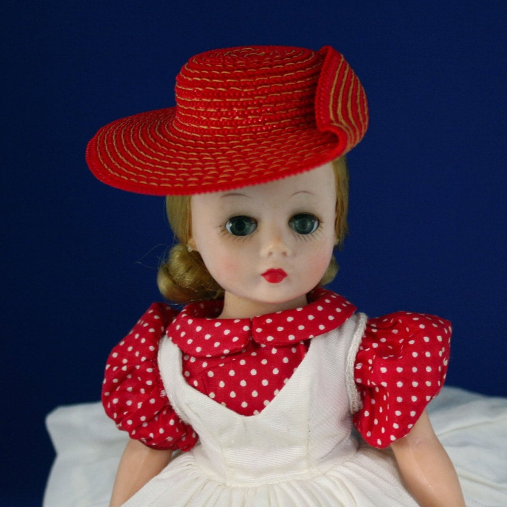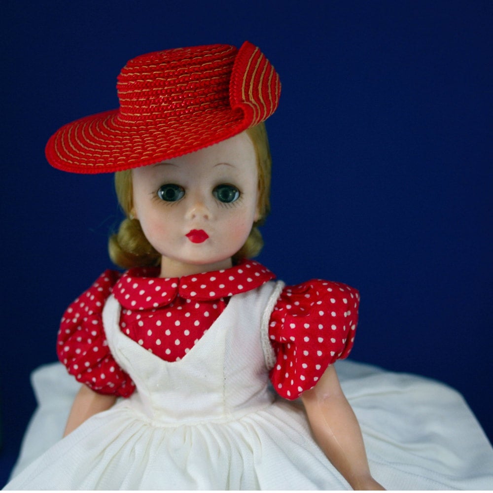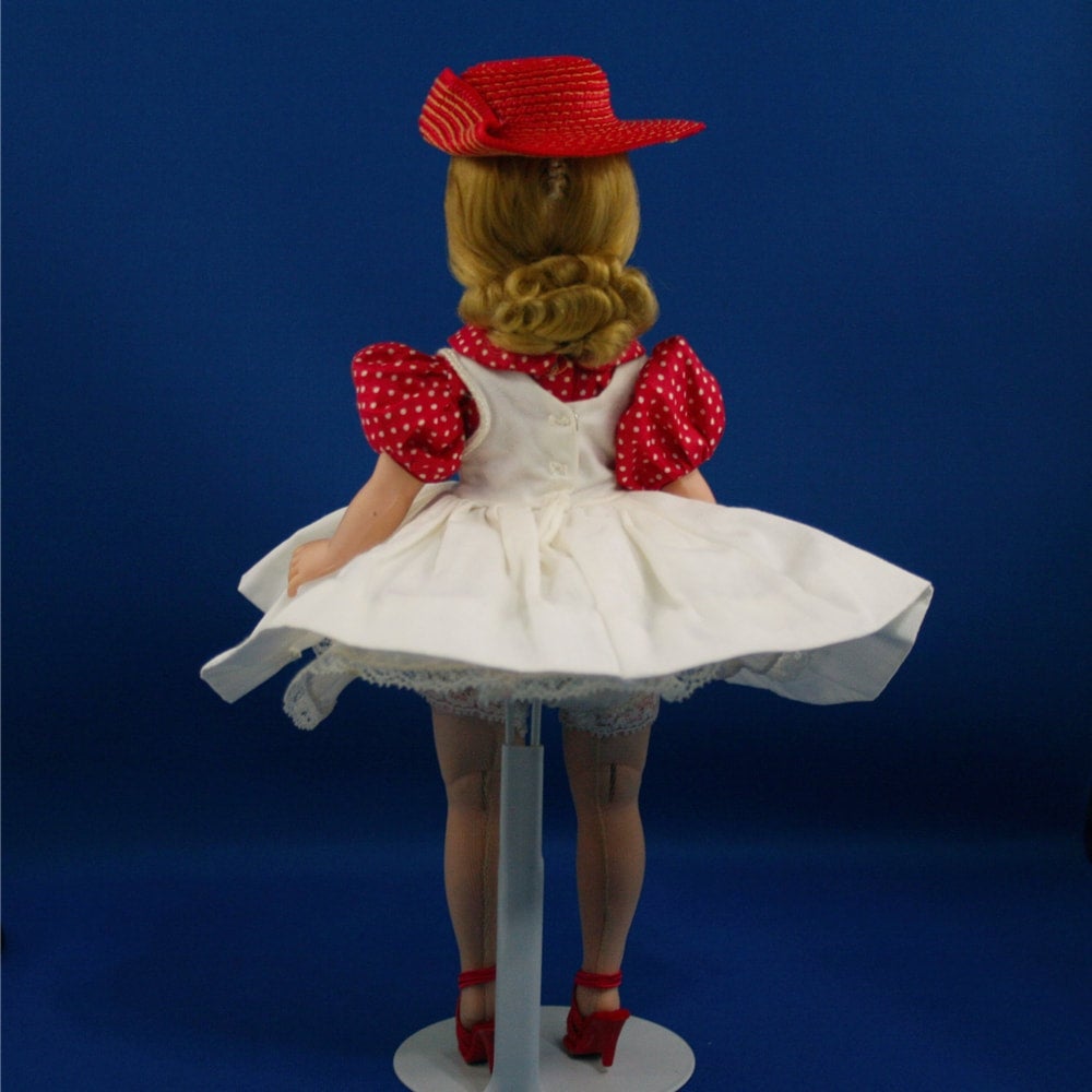 #919 Blond; Perfect face paint and a great body. Her elegant hair has a beautiful cluster of shiny curls at the nap of her neck. Both pinafore of white polished cotton and red dotted cotton blouse are near mint to mint. The hat's turned back brim adds that spot of Alexander sophistication. Her darling red heels are near mint with slightly relaxed elastic and hose and white taffeta half slip and panties are near mint to mint.
