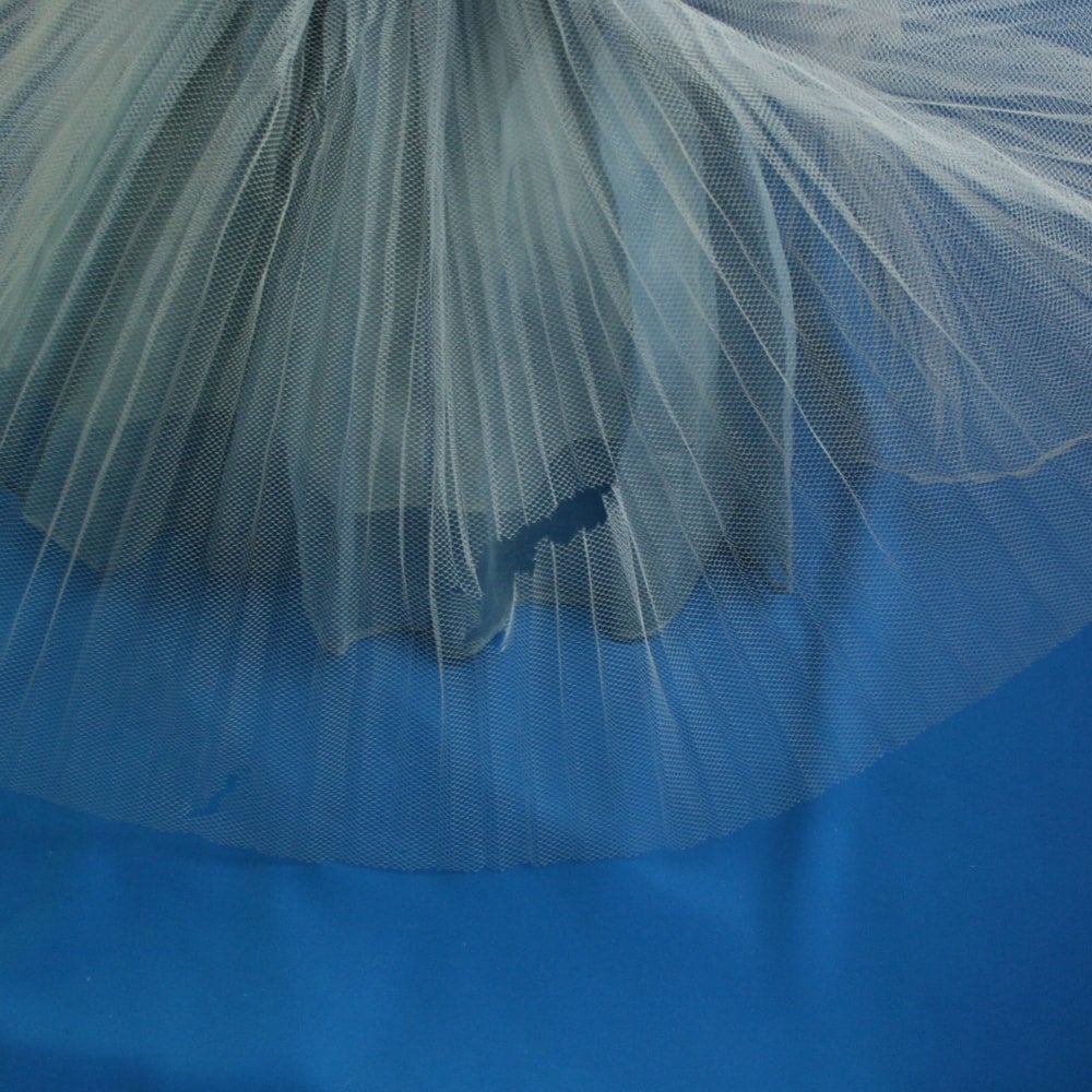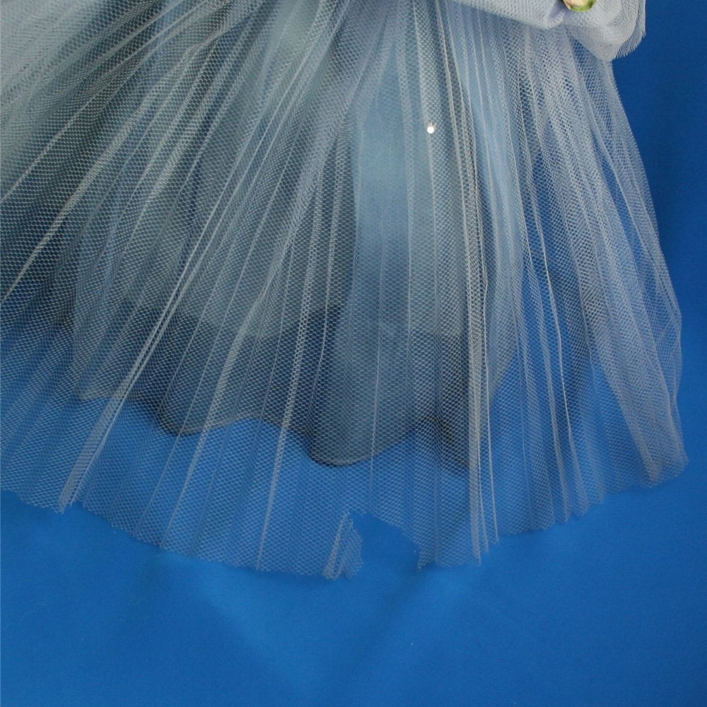 - Gown: Dotted with rhinestones and roses, and retaining much of its knife pleating, the net over-skirt has fading. The cornflower blue under-skirt has kept much of its color. Two tears in the top-skirt are hard to see because of the massive amount of tulle.