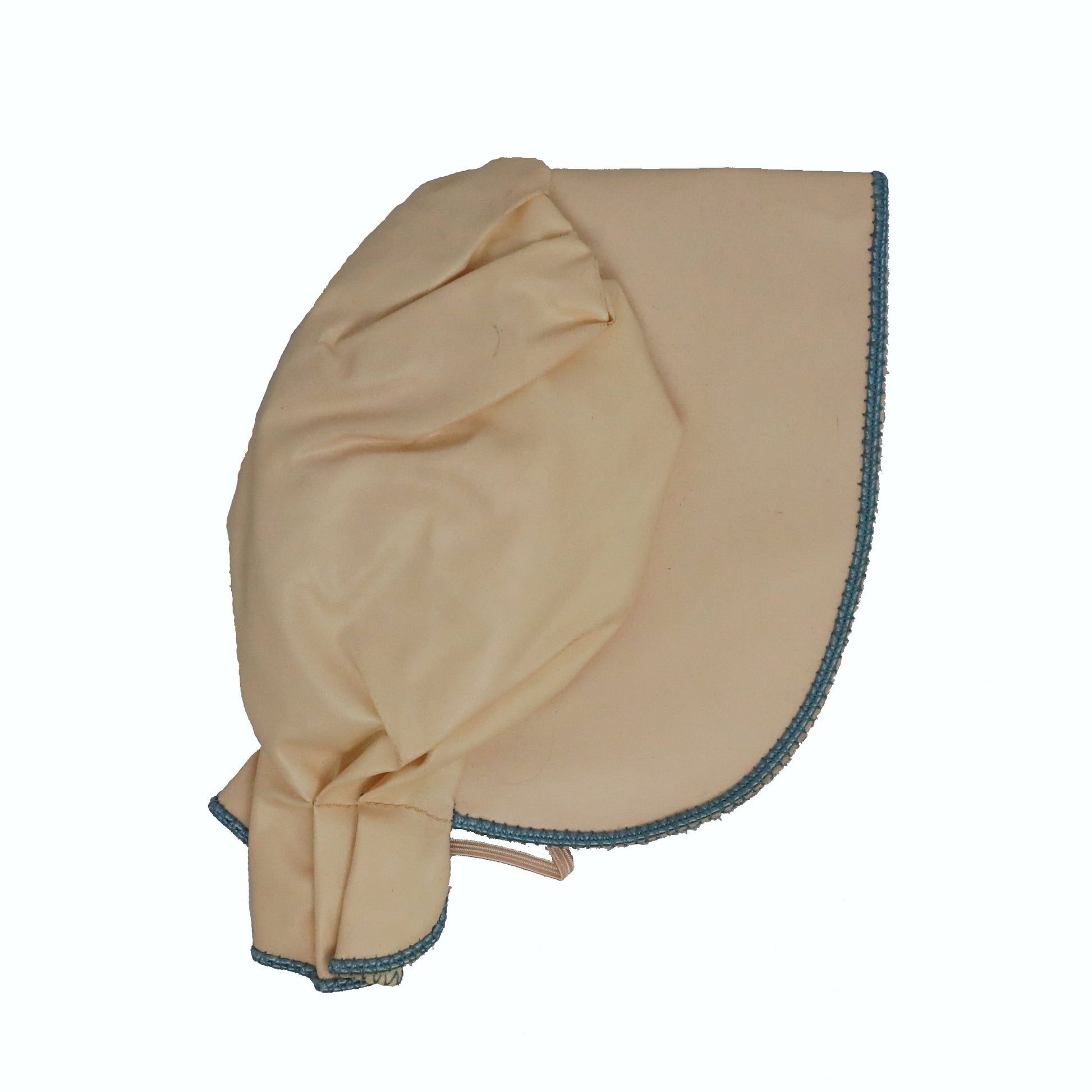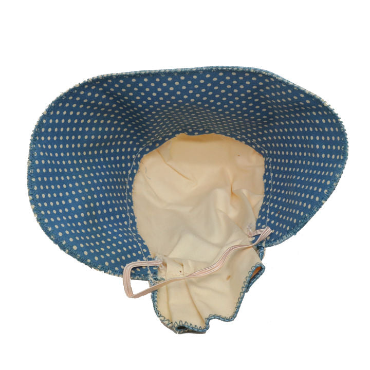 - Bonnet: Pink vinyl with blue trim; Lining of the brim matches coat's blue lining with white dots.