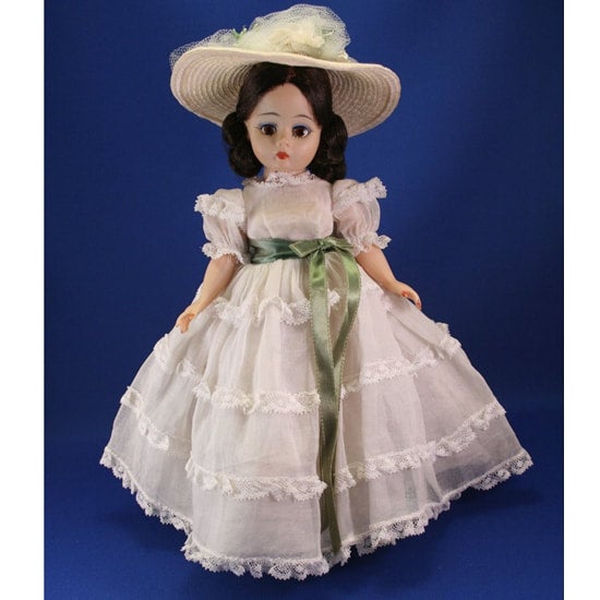 Cissette mold. White gown with green satin ribbon trim. Matching pantaloons. Large brim white straw hat with tulle, flower, and ribbon trim. Condition is generally excellent, not played with as much as the look of time. Green enclosed heels. Her hair is very nice, seems in original set with hardly any fly-always. Her face paint is all there, skin tone is light.