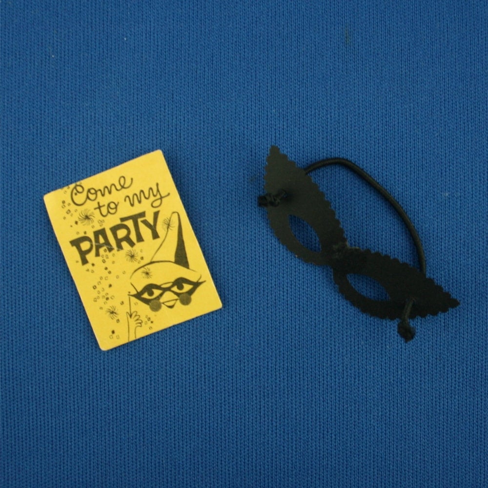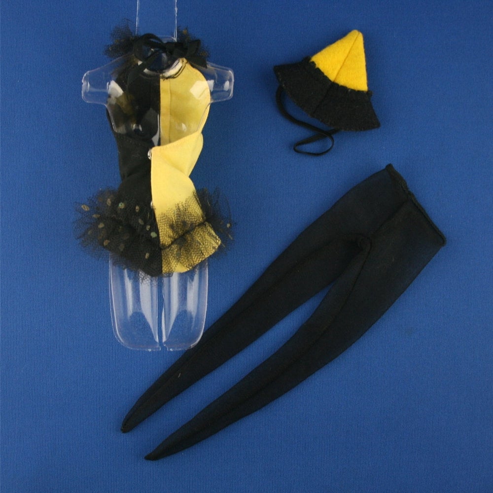 Complete with very hard to find original pom-poms on shoes. The waist on the hose is lightly stretched with a 1/4" snag in back; light handling of the invitation; elastic on the hat is lightly stretched.