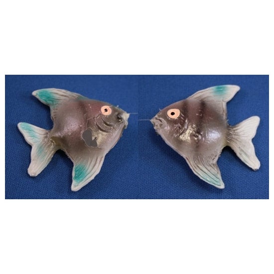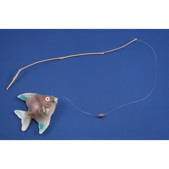 Rope handle is missing. Fish has a small hole on one side. Pole is broken and about an inch shorter than it should be.